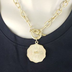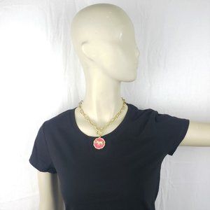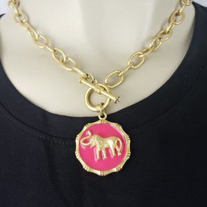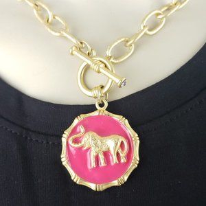 This is a beautiful gold necklace from Fornash featuring a cute Pink elephant pendant. It has a toggle closure with rhinestone ends. The necklace measures about 18" long and the pendant is about 1-1/4" across.