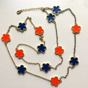 Cute necklace of blue and orange enamel flowers with gold-colored chain