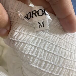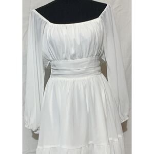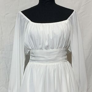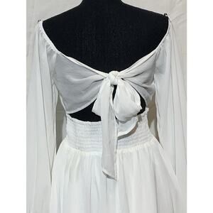 Beautiful white dress with flowy sheet sleeves and an open tie back. Dress does have a few faint stains, please see pics. Would be perfect for a bridal shower or wedding reception. Size Medium underarm-underarm 17”. Length. 34”