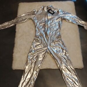 Dazzle in this metallic silver jumpsuit. Features a sleek mock neck design. Ideal for standout occasions. Inseam 28 inches, sleeves 21.5 inches long