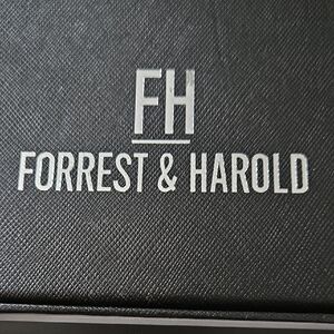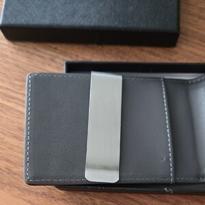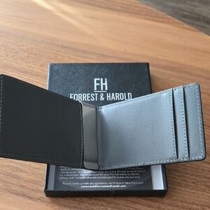 Sleek and stylish black money clip wallet by Forrest & Harold featuring a sophisticated silver accent. Perfect for the modern man.