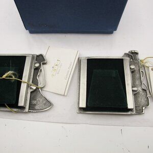 Fort Pewter 2*2 golfing picture frames – one has lady golfer in dress swinging, and the other is a golf bag. There is no glass in the frames. These are NEW IN BOX – bought as set – and never used. These are from Fort, a Rhode Island company.