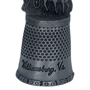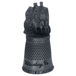 This attractive pewter thimble features a Williamsburg Virginia historical building with horse and buggy.