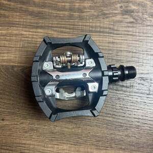 Forte Contact Trail MTB Bike Clipless Pedals. These pedals are designed for mountain biking, offering a secure connection between your shoes and the bike for efficient power transfer. They are in used condition, showing normal signs of wear from trail riding, but are fully functional and ready for your next adventure.