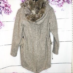 Herringbone parka jacket with Side flap pockets, Rear vent Drawstring on the waist and on the hood Fur inset. Adjustable cuffs with velcro and Inner fur removable waistcoat, Double-slider zip closure.