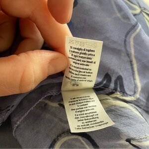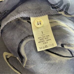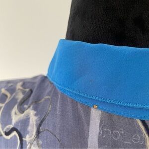 Gorgeous 100% silk floral pattern button down blouse with hidden button placket and exposed decorative button at collar. Semi sheer. Elastic cuffs. 3/4 sleeve. Main color is a blueish purple and collar is a bright blue. Faint spot on collar at back of neck but in overall excellent condition.