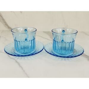 Fortecrisa Azure Ice Blue Glass Tea Cup Saucer 70's Interior Ribbed 3" Mexico x4