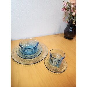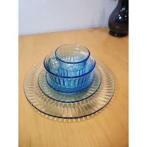 Keywords: Fortecrisa glassware set, vintage blue dinnerware, ribbed glass dishes, mid-century glass, table setting bundle, pressed glass blue dishes