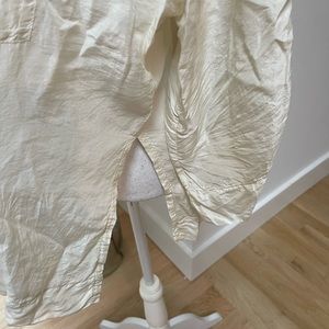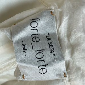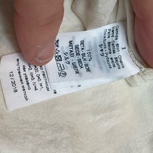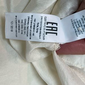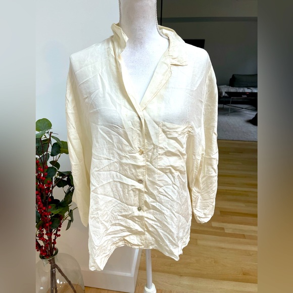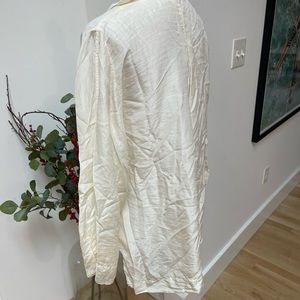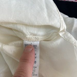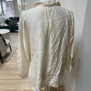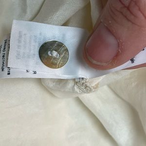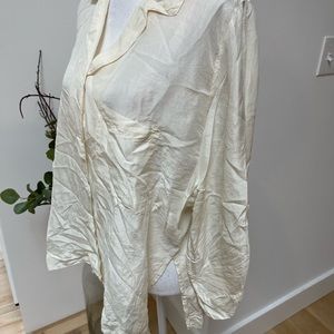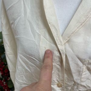 Beautiful silk off white / more of a winter white silk blouse. Button down front with a slight V. Is a bit wrinkled and can use a press but also looks great more casually worn. There is one mark shown on front of blouse. Photo shown. Price reflects gentle wear.