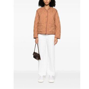 This boxy-cut jacket has a light pink finish with a subtle sheen, giving its quilted padded design a polished edge. Detailed with piped trim, a collarless neckline, press-stud buttons, and two patch pockets, it balances utility with elegance. The straight hem and reversible construction make it a versatile layer for both casual and refined looks.