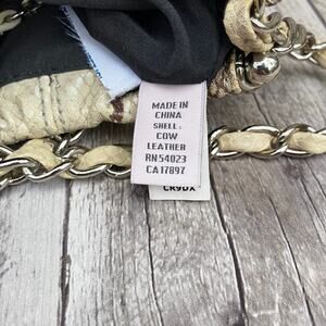 Color/pattern: neutral colored reptile/snake embossed. Silver tone hardware and silver tone double braided chain straps