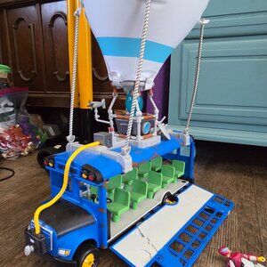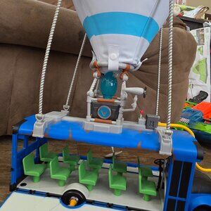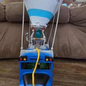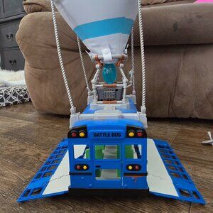 Fortnite Battle Bus opens on both sides to fit multiple figurines. Antenna is broken off and one of the arms of the balloon has been glued back together.