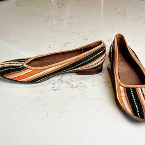 Fortress of Inca (Anthropologie/Free People) striped fabric flats in shades of cream, tan, brown, orange, green and yellow and blue.