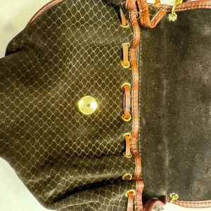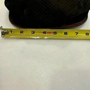 A rare find. The bag is in great condition. Has a snap closure flap front. Pull leather band inside. It measures 7” wide by 5” wide with a depth of 2”.