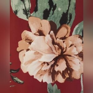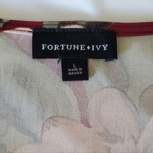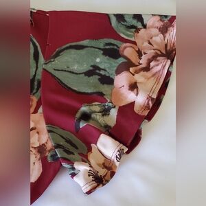 Fortune & Ivy floral V-neck wrap dress features a burgundy base with green and cream floral patterns. this dress is perfect for many occasions. The ruffled sleeves add a touch of femininity.