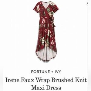 Fortune & Ivy floral V-neck wrap dress features a burgundy base with green and cream floral patterns. this dress is perfect for many occasions. The ruffled sleeves add a touch of femininity. Pair with a denim jacket for a casual-chic look. ** Stretch fabric fit ** Flared hi-low skirt ** Elastic empire waist ** 18" inch Pit to Pit ** 15" inch Waist ** 44" inch front length 51" inch back length ** 91% Polyester 9% Spandex ** Machine wash cold/ Line dry ** Excellent Condition ** Smoke Free Home 🏡 I-15