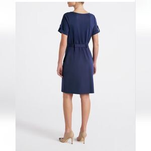 Sophisticated navy midi dress featuring stylish button accents and a flattering tie waist. Perfect for any occasion. Classic. Size medium