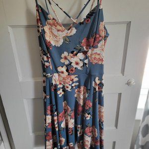 Gently used; Fortune & Ivy floral dress, originally bought from Stitch Fix. Size medium, blue. A-line, circle skirt, hits above the knee. Soft knit fabric