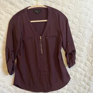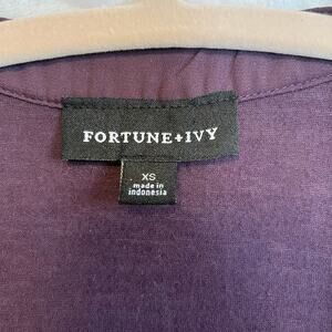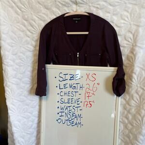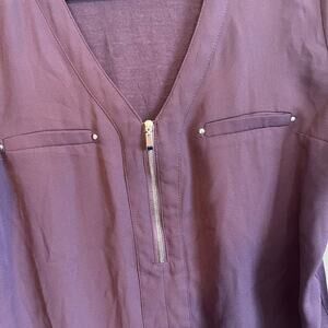 Fortune + Ivy purple top v-neck with 2 front pockets front zipper sz XS rollable sleeves