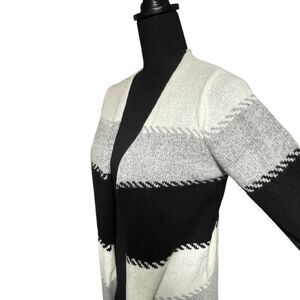 Features and details: very soft medium weight material, hatched stripe design all over, no pockets, open front, v neckline, longline length