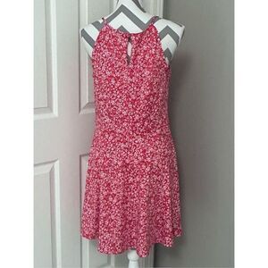 Adorable dusty red polyester dress with white floral pattern in size large. EUC! Worn once. Spaghetti straps with ruffle detail around neckline. Fit and flare design. Great weight to fabric so not see through. Pair with a white or pink sweater for Valentine’s, navy sweater or denim jacket for patriotic holidays, or simply with a cute pair of white sneakers for casual days.