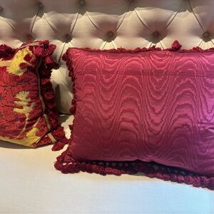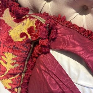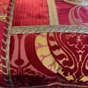 Add a touch of luxury to your home with these large red and gold accent pillows. Perfect for enhancing any living space.$200 each. Bundle and save 20%. Each pillow is 23 inches x 17 inches not including red fringe. Purchased in Venice and in perfect condition.