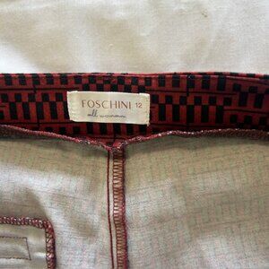 Foschini Ladies Pants sz 12 Red Black Ankle. Good condition, do not tumble dry. Check measurements, sz 12 is South African, maybe a 10 USA. 2 Faux back pockets, cold machine wash, line dry, cool iron if needed, 97% cotton, 3 % spandex, length 35.8 in, waist 32.8 in, rise 9.5 in, inseam 26.5 in.