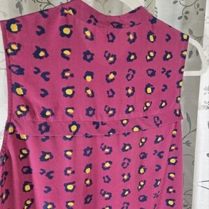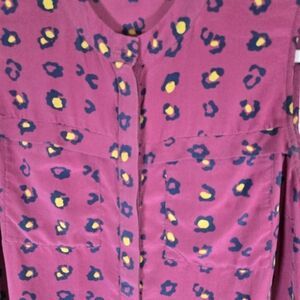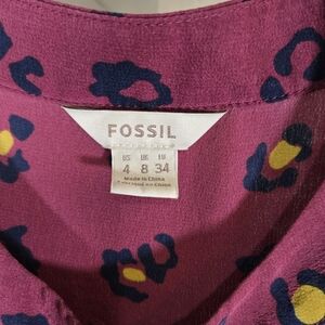 Add a pop of bold style to your wardrobe with this eye-catching Fossil sleeveless silk blouse in a size 4. Crafted from 100% silk, this lightweight and breathable button-down shirt features a vibrant magenta background with an allover navy and yellow cheetah print—perfect for adding a fun, statement look to any outfit.