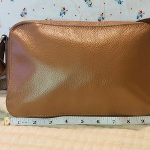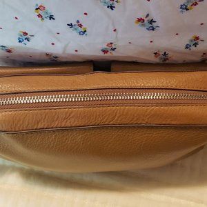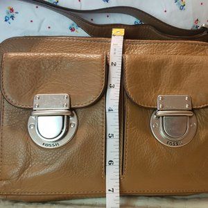 Lighter brown leather , Genuine Fossil, super clean with adjustable strap, goes from approx. 26" - 52". 2 front pockets, one zip pocket and 2 slip pockets inside