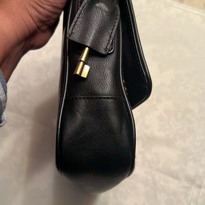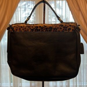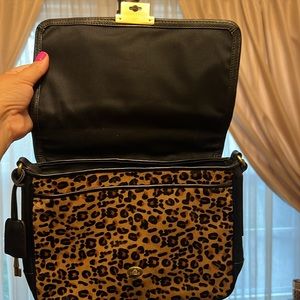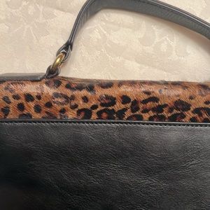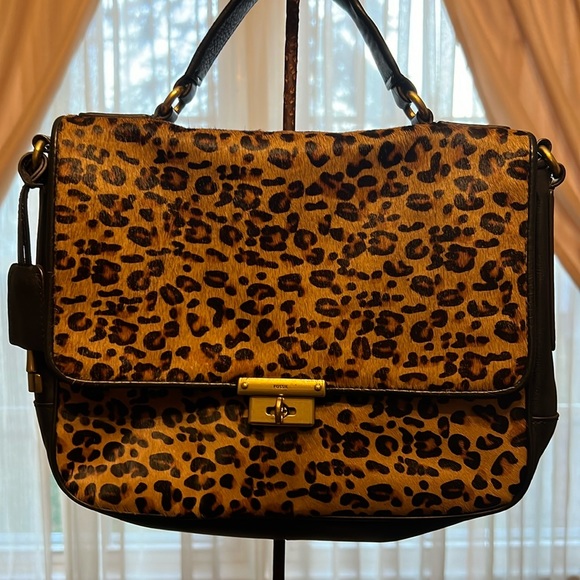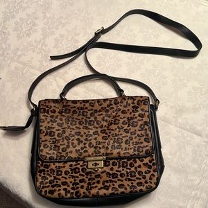 Fossil leather and hair outside front. 12Wx8H with handle and crossbody strap. Outside back pocket inside zipper pocket. Clean cloth inside no tears. A little wear on hair on back of bag as shown in last pic.