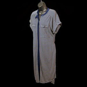 100% tencel jersey material. Has a nice weight to it. Buttons all the way down. Has a tie for around waist. Front is slightly shorter than back. Front approx 34" long and longest back part is approx 37 1/2 inches long. Chest is approx 20" pit to pit. Color is blue and white striped, and size is medium.