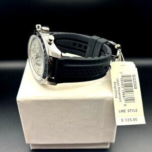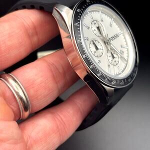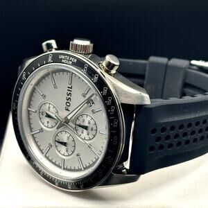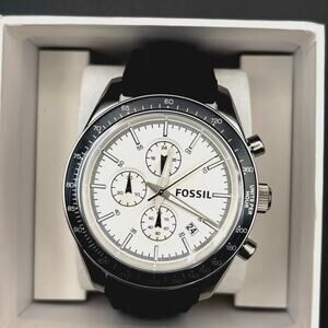 The Fossil Autocross BQ2068 delivers a clean sport-inspired look with a racing chronograph layout and modern performance styling. The silver-tone stainless steel case frames a crisp white dial with three subdials, tachymeter bezel, and bold silver hands for excellent legibility. A perforated black silicone strap adds comfort and durability while maintaining an athletic profile ideal for everyday wear or casual performance use.