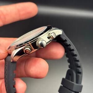 Powered by a reliable quartz chronograph movement, this model features a date window at 4 o’clock, push-button stopwatch function, and water resistance suitable for daily use. The balanced design makes it versatile enough for both active and casual settings.