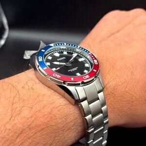 Fossil BQM2883 Mens Black Dial Pepsi Bezel Stainless Steel Diver Style Watch NIB