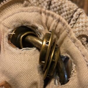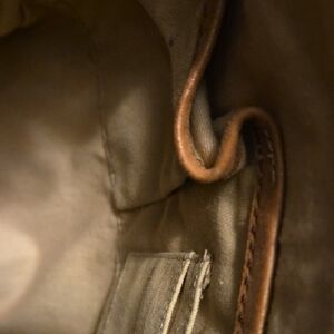 preloved callouts a few small dark spots on lower tan part of back shown in photo and fasteners on both sides of back arnt attached to outside of bag but doesn't effect bag works perfect