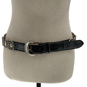 Fossil Black Croco Embossed Cowhide Belt Scrolled Silver Tone Accents/Buckle - L