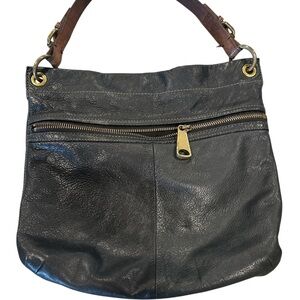 This Fossil hobo bag in classic black features a slouchy design with a single curved shoulder strap and gold-tone hardware. Crafted for everyday use, it combines style and practicality with its spacious interior and elegant finish.