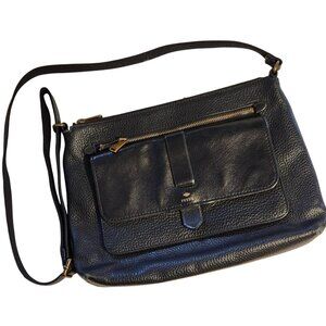 This Fossil crossbody bag offers functionality with a sleek design. Crafted from durable black leather, it features an adjustable strap and ample storage space.