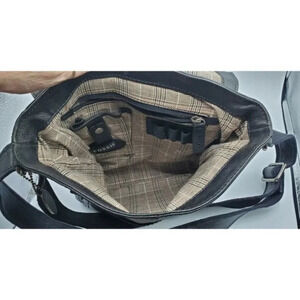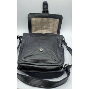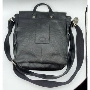 Fossil Black Leather 'Decker City' Shoulder Bag Purse Made of Rich Full Grain Leather, Great for Work or Travel. It Features Tumbled Full-Grain Leather, Flap-Over Top with Magnetic Closure, Antique Finish Hardware, Large Entry Front Pocket and Adjustable Shoulder Strap. The Inside Features a Plaid Nylon Lining, Mobile Pocket, Pen Holders and Zip Pocket. Measurements (Approx.): 10" L X 3" W x 11" H Model: MBG1164. Excellent "Like New" Condition ~ Still Has Plastic Tag Holder on Purse Charm