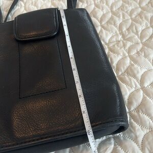 This little bag has a Large number of features! The fold-over phone pocket has a snap closure on the outside of the bag. My iPhone 16 plus fits into it great! There is also a fold-over strap that snaps closing the additional 3 divided sections in the inside of the bag. The middle section has a leather tab-zipper closure. The inner most section has the Fossil insignia and a zippered inside pocket. The entire bag is made of a sturdy black leather including the dual straps. This is a bag to help with organization while being extremely cute! Clean in the inside and outside!