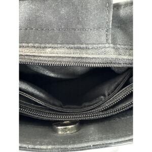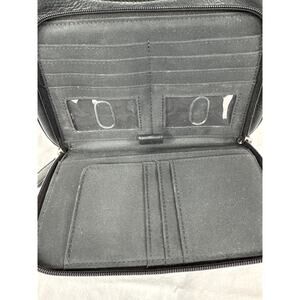 Features a front pocket with snap closure. A main magnetic snap closure compartment that has 2 interior divided zippered pockets. Back pocket unzips into an organizer for your ID, credit cards, pen etc
