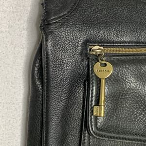 Fossil Black Leather Saddle Shoulder Bag Purse Large Zip Closure Key Charm