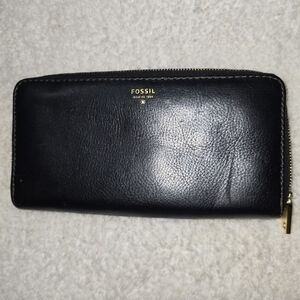 Sleek black leather wallet by Fossil. Features a zip-around closure. Excellent Pre-owned Condition.