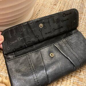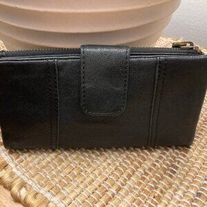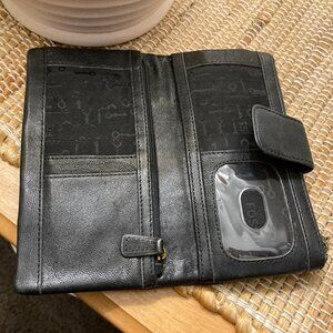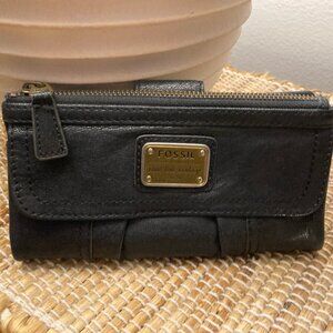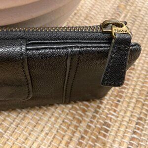 Signature Fossil and leather zipper pull. Pebbled black leather with beautiful edges. All zippers and snaps in excellent working condition.