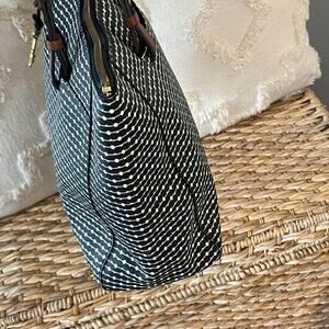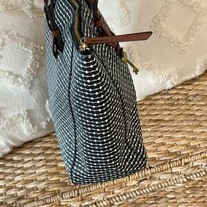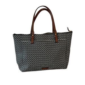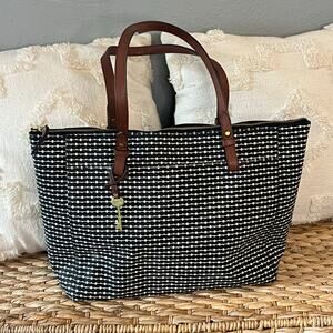 This authentic Fossil tote bag features a black and white dotted stripe woven canvas exterior accented with genuine brown leather handles and brass hardware. It includes the signature Fossil key charm for a classic touch. The bag has a full top zip closure, a spacious black fabric interior with a zip pocket and two open slip pockets, perfect for carrying daily essentials, travel, or work items.