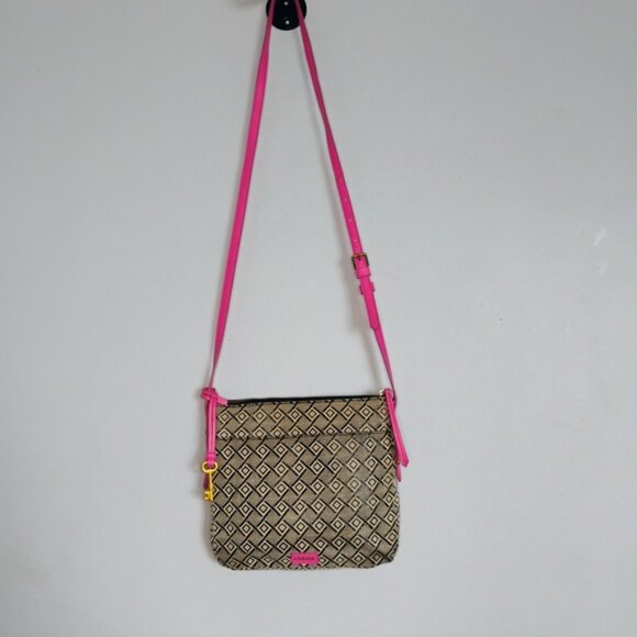 Fossil Black White Weave Geometric Pattern with Pink Leather Trim Crossbody Bag