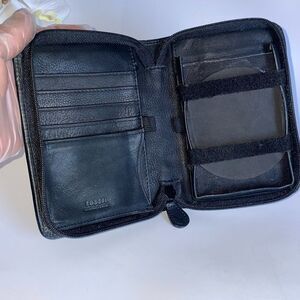 Sleek black leather wallet by Fossil. Compact and stylish design. 5 card slots, I’d pocket, bill pocket and a place to keep your cellphone save on the other panel.