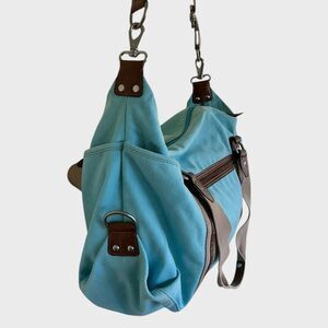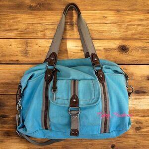 Fossil Blue Canvas Duffel Travel Bag Leather Trim