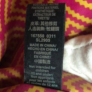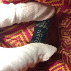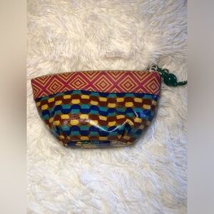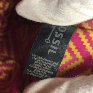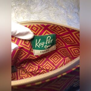 Charming Fossil pouch featuring a blue elephant design. Accented with a pink geometric trim.