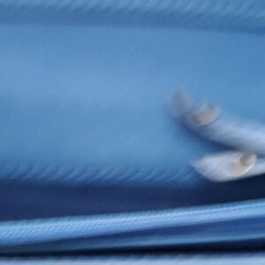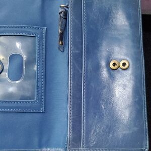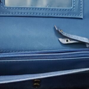 Elegant blue wallet with embossed heart design. Features gold stud accents. Ideal for daily use.